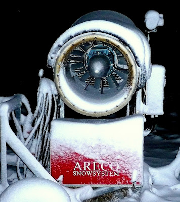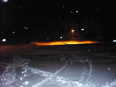 Mitäpä sitä muutakaan ensilumien sataessa, kuin rynnätään pulkkamaäkeen. Keskellä yötä tietenkin. Pulkkaa ei löytynyt omasta takaa eikä sitä löytynyt myöskään 24h huoltsikaltakaan. Pulkka on nyt lisätty ostoslistalle ja  paremman puutteessa kelpasi tällä kertaa jätesäkit. Jätesäkit olalle, kaveri kyytiin, kaakaot termariin ja mäkeen! En tosin ensin meinnut uskaltaa tuonne mäkeen koska a) siellä oli pimeetä, b) olin just lukenu uutisen susista, c) sieltä kuului kova pauke ja noi vähäisetkin valot himmeni välillä itekseen ja sit taas kirkastu. Miljöö oli kertakaikkiaan sanalla sanoen Spooky ja minä saatan toisinaan olla vähän säikky.