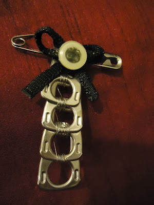 Ihan omaksi iloksi koitin jotain väsätä. Siitä tuli sitten "rintamerkki" jossa tölkkinipsuja, turvavyötä ja nappi.