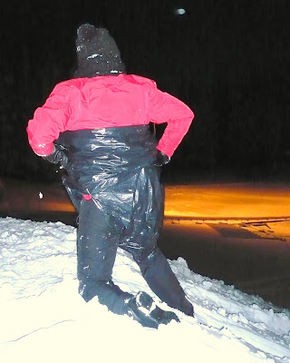 Sain psyykattua itseäni ja sitten päästiin mäkeen. Tietenkin tyylillä, vaikka tämä nyt ei olekaan mikään muotiblogi, niin kerron silti teille mistä huoliteltu ulkomuotoni mäkeä laskiessa muodostui. Jätesäkki aka kokovartalokondomi marketin hyllyltä, punainen takki Siilinjärven Pesiksen C- tai B-tyttöjen edustustakki vuodelta nakki ja tuulihousut merkkiä Odlo, ostin joskus Kuopiosta.